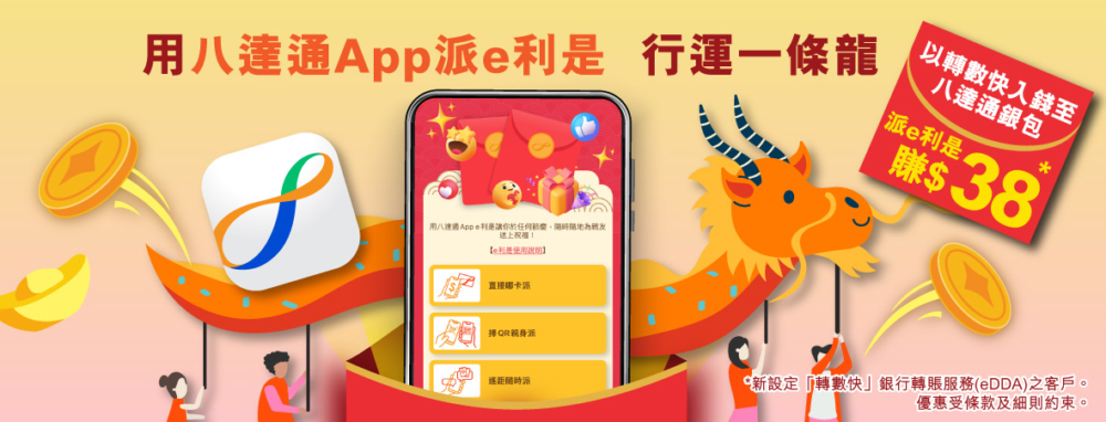 立即幫銀包「入定錢」,派利是賺利是!做完以下步驟嘅合資格客戶可賺 HK$38* 回贈,入錢至八達通銀包,再儲存銀行賬戶^,然後派一封 HK$100 以上嘅「e利是」!以後無論派 e 利是抑或增值八達通,都可以直接從銀行戶口過數,更快更方便!活動由即日起至2024年4月30日,獎賞名額有限,送完即止。了解更多:bit.ly/3UtxSrZ