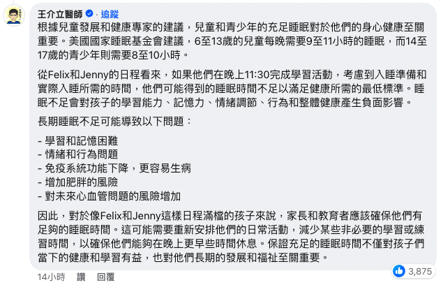 此外,見到台灣腎臟科醫生王介立在留言區提出意見,他指:「根據兒童發展和健康專家的建議,兒童和青少年的充足睡眠對於他們的身心健康至關重要。美國國家睡眠基金會建議,6至13歲的兒童每晚需要9至11小時的睡眠,而14至17歲的青少年則需要8至10小時」,而睡眠不足會對孩子的學習能力、記憶力、情緒調節、行為和整體健康產生負面影響,長期睡眠不足更可能會導致:「1. 學習和記憶困難 2. 情緒和行為問題 3. 免疫系統功能下降,更容易生病 4. 增加肥胖的風險 5. 對未來心血管問題的風險增加」。