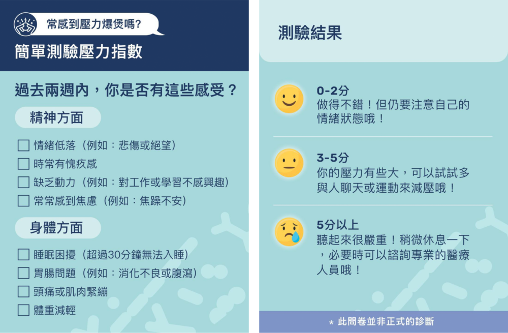 媽媽們如果想要了解自己的情緒狀況,歡迎進行以下簡單的自我評估測驗。請留意,這個測驗不能替代專業的診斷,如果測驗結果為五分以上,可能需要尋求專業人士協助。