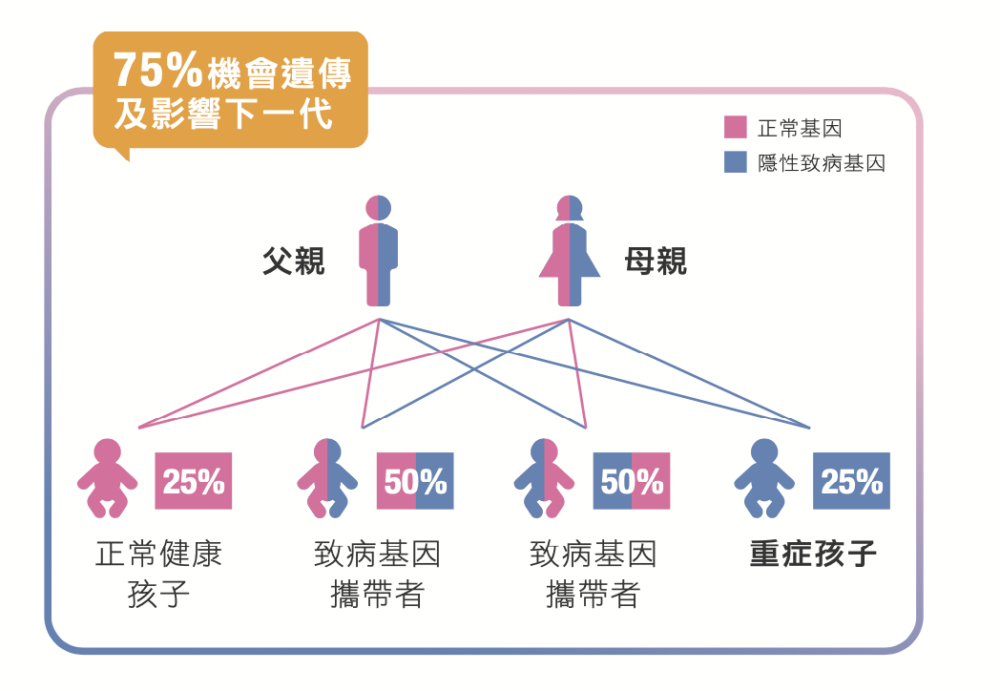 隱性致病基因存在於染色體當中,如父母的基因帶有異常或突變性質,便有機會遺傳給下一代。即使父母以至整個家族未曾患病,小朋友都有機會病發而成為家族中首個病例。