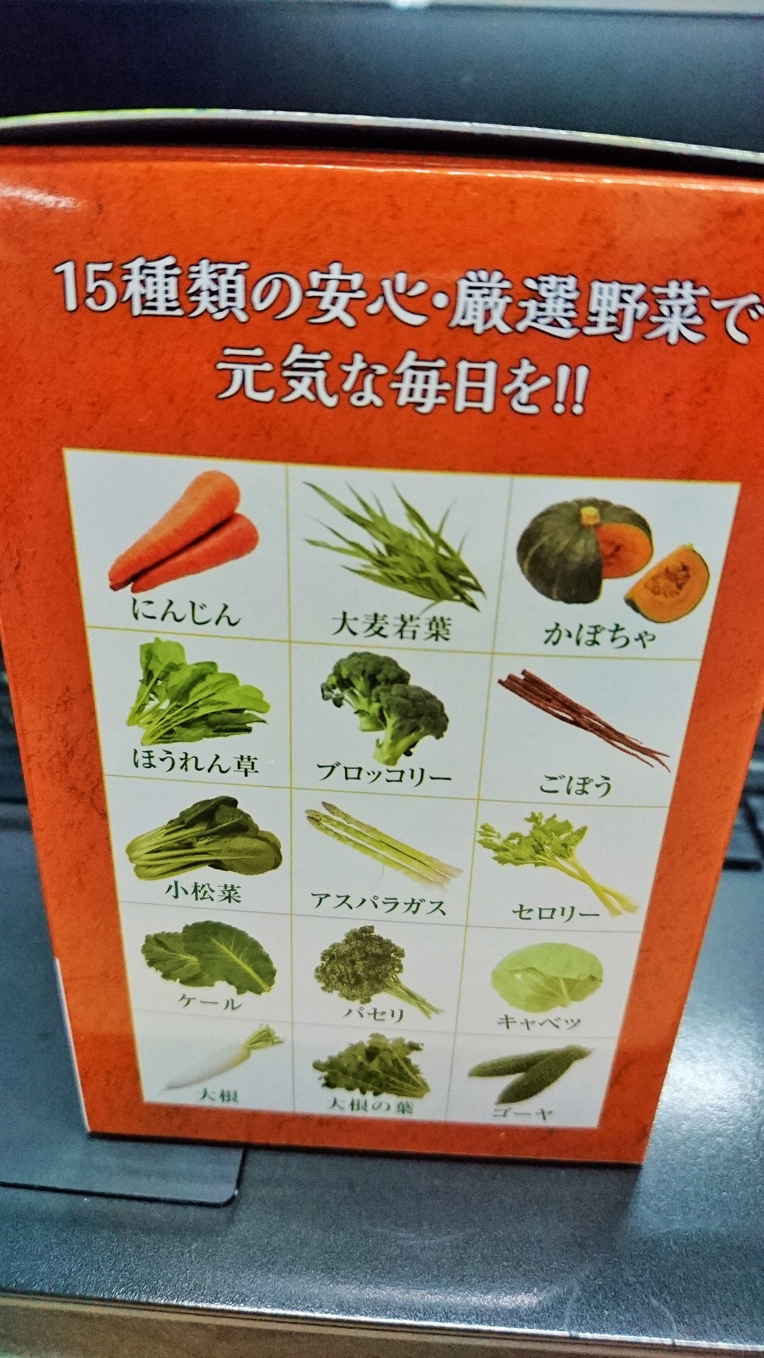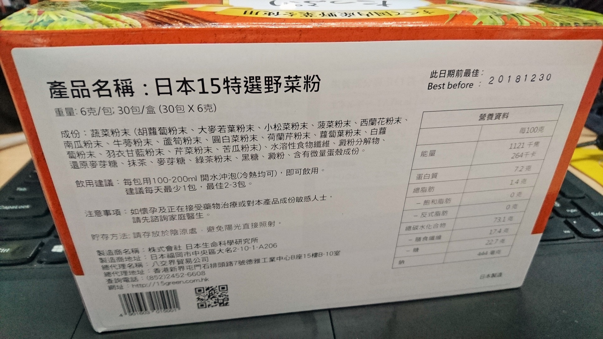 15特選野菜粉嚴選日本九州15種有機蔬菜,包括新鮮苦瓜、圓白菜、胡蘿蔔、西蘭花、小松菜、蘆筍、牛蒡、羽衣甘藍、荷蘭芹、蘿蔔葉、南瓜、芹菜、菠菜、白蘿蔔、大麥若葉等等。以日本最先進嘅自家獨特技術,將新鮮蔬菜不經任何烹煮,由頭到尾,連根帶皮微粉碎,達致保存新鮮蔬菜原有營養。