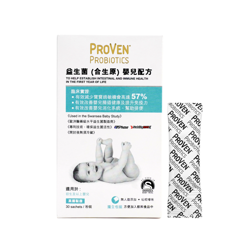 BB 出生後亦可以補充英國 ProVen 益生菌嬰兒配方,專為初生嬰兒配製而成的益生菌補充劑,選用世界專利 Lab4b 益生菌配方,供給初生嬰兒及幼兒所需的益生菌,臨床證實,補充益生菌可以改善初生嬰兒及兒童腸胃健康、提升腸道健康及免疫力、抑壓壞菌繁殖適合腸胃不適人士、幫助排便、促進消化系統健康、幫助營養吸收,更有效減低嬰兒對常見的過敏原, 如花粉、塵蟎、牛奶、雞蛋、貓毛等過敏機率 。
