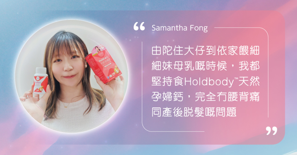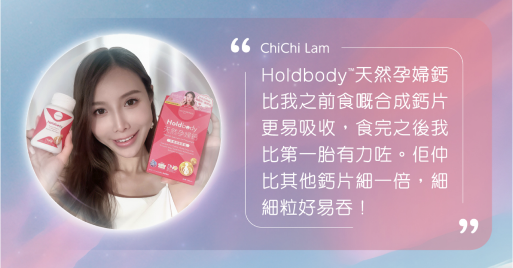 我好注重補充鈣質,由陀住大仔嘅時候我已經開始食 Holdbody 天然孕婦鈣,到依家餵細細妹母乳都堅持繼續食。好多人都話陀住個 B 真係好易攰,BB 越嚟越大成日都會覺得腰酸背痛,產後脫髮又會好嚴重。但我生左三個小朋友,關節仲好靈活,可以同小朋友周圍去玩,髮量仲可以keep住咁多,全靠 Holdbody 天然孕婦鈣,幫我補足鈣質!