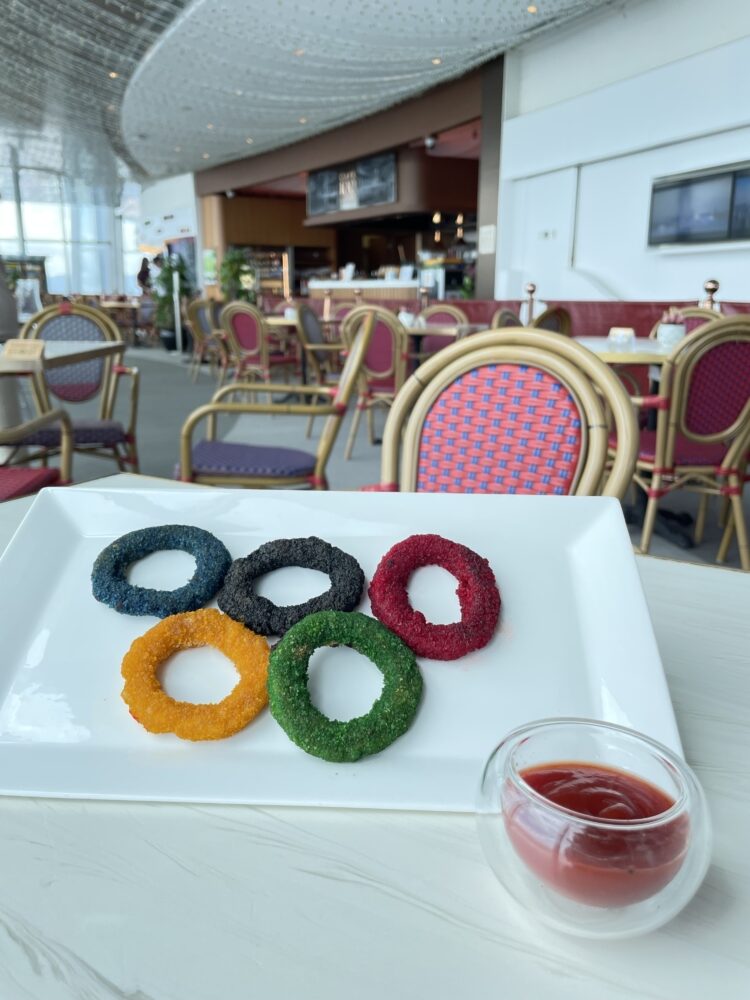 Café 100 坐擁觀景台西面嘅廣闊海景,一邊享受美食,一邊可以飽覽一望無際嘅海景,絕對係一場味覺同視覺嘅盛宴。特別推出「港式經典」下午茶餐,包括 3 款地道美食 —— 美味彈牙嘅魚 蛋、色澤金黃、口感豐富嘅蛋撻同埋生津解渴消暑必備嘅蔗汁;加埋新鮮烤製嘅熱辣辣「雞蛋仔」外脆內軟,散發住濃郁蛋香,非常滿足! 仲有以奧運五環為靈感嘅「五環洋蔥圈」,組合五種唔同顏色嘅洋蔥圈,惹味鬆脆,一試難忘!