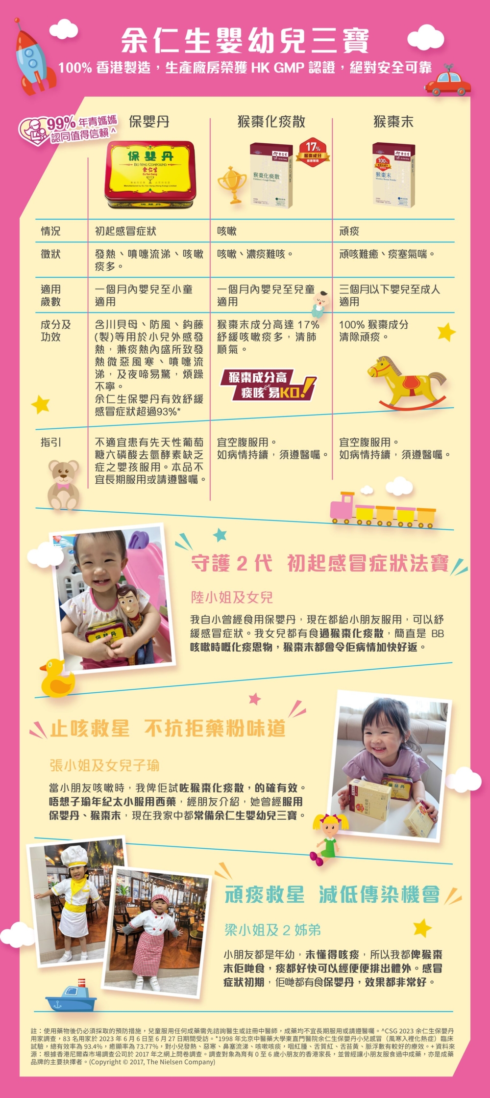余仁生「嬰幼兒三寶」成分天然,100%香港製造,余仁生更通過國際認可的ISO 9001及香港GMP認證,符合安全標準,小朋友都放心食用,及時紓緩感冒症狀不適,轉季時居家必備!