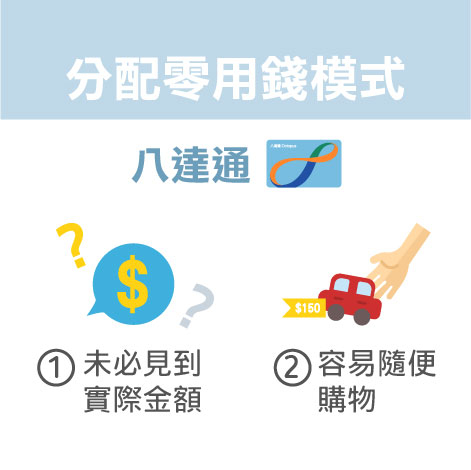 孩子使用零用錢通常是以現金或八達通形式。若前者,孩子可以以「真金百銀」來衡量手中金額多少,進而思考購物的可能性。而後者,因為孩子未必見到實際金額,就比較容易不作考慮便隨便購物。當然,孩子擁有自己的八達通的時候,父母必須清楚說明用途,以及予以監管,而避他濫用金錢。