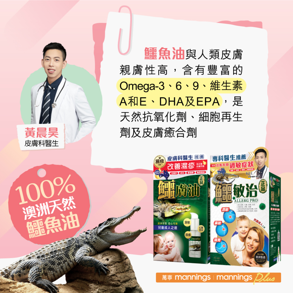 皮膚科醫生黃晨昊指出,鱷魚油本身與人類皮膚親膚性高,而且含有豐富的 Omega-3、6、9、維生素 A 和 E、DHA 及 EPA,是天然抗氧化劑、細胞再生劑及皮膚癒合劑,能有效抑菌、殺菌及抗炎。因而鱷魚油有「液態黃金」的美譽。想有效改善濕敏問題,記得到萬寧購買「正品鱷膚油」、「正品鱷敏治」,內服外用,濕疹救星。