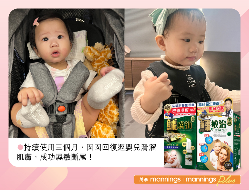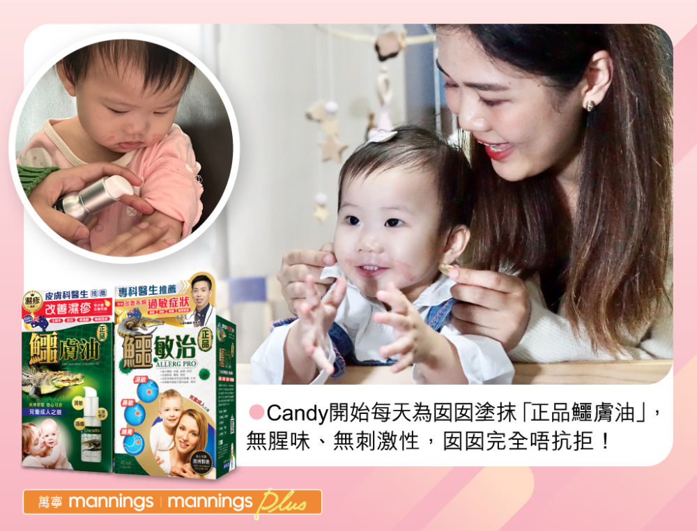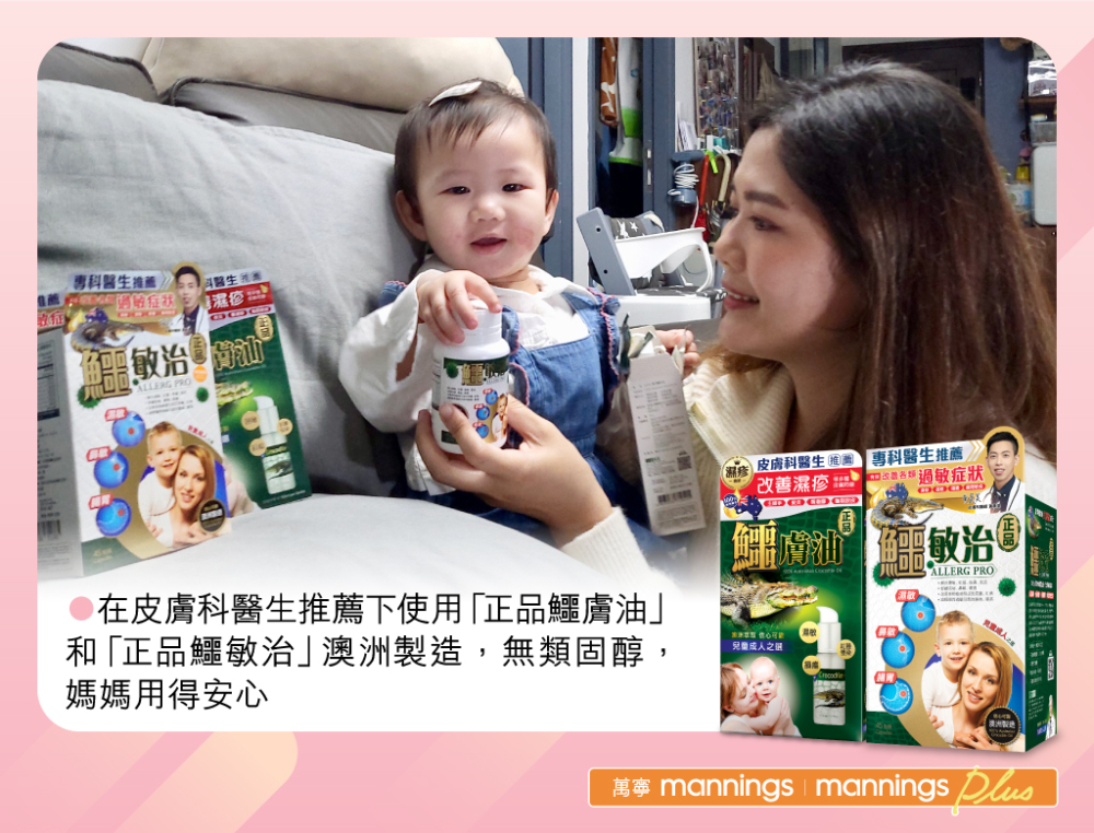 後來在皮膚科醫生推薦下使用「正品鱷膚油」和「正品鱷敏治」。這兩款產品的 成分是鱷魚油,100%萃取自受澳洲政府管制的 Darwin 灣鱷,並無添加類固醇及防腐劑,初生嬰兒亦可放心使用,是一個安全可靠的選擇。
