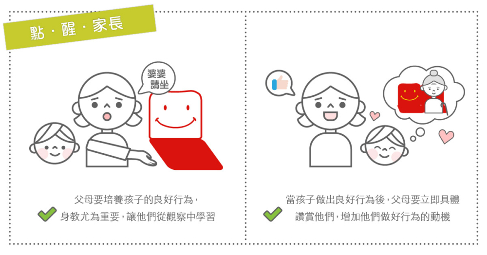 在日常生活中,父母是孩子的榜樣;父母的一舉一動,孩子都看在眼裏,觀察及模仿。要培養孩子的良好品德,例如:對人有禮、體諒別人及有同理心等,並不是紙上談兵或以說教形式進行,父母的身教尤為重要,為孩子作好榜樣,讓他們具體明白什麼是良好行為。