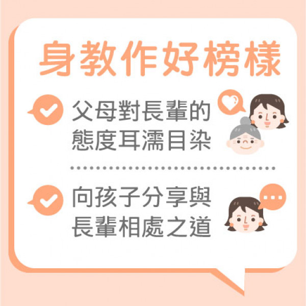 父母以身作則同樣是培養孩子尊重長輩的有效方法,由於孩子對長輩的態度和行為,往往受到父母耳濡目染,因此,父母平時對長輩要多關心、多溝通;亦可向孩子分享一些與長輩愉快相處的回憶,讓他們明白長輩的人生閱歷豐富,值得受人尊重;在公共交通工具上,父母可以讓座予長者等,都是孩子學習尊重長輩的生活例子。