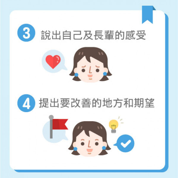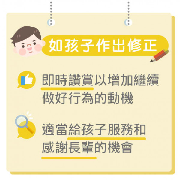這時父母先要體諒他們,再向他們作正確的指導。孩子年紀小,不像成年人般懂得修飾自己的言詞,及未懂得從其他人的角度作出思考,所以有時對長輩說出或做出一些不敬的言行,令長輩感到不悅。要處理這情況時,父母要冷靜情緒,向孩子循循善誘地解釋,令他們知錯能改,例如:父母可以先向孩子明確地說明不尊重長輩是不當的行為,說出自己感到傷心、難過的感受,及長輩的感受,再向孩子提出要改善的地方和期望,當孩子作出修正,尊重長輩之時,父母要對孩子作出即時的讚賞,以增加他們繼續做好行為的動機。