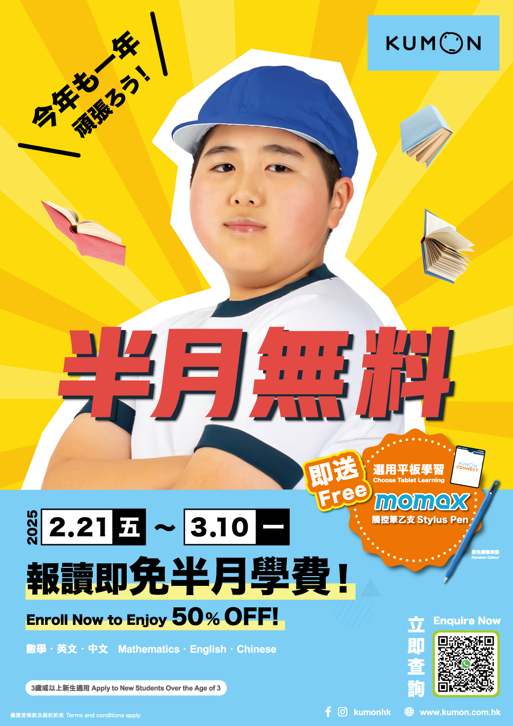 即日起至3月10日,KUMON推出「半月無料」優惠活動,讓更多小朋友感受KUMON的學習優勢,從「恰到好處的學習」教學方法中享受學習成效。