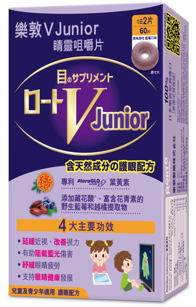 樂敦 V junior護眼系列亦包括「樂敦 V Junior睛靈咀嚼片」,可以抗藍光、舒緩眼睛疲勞,讓眼睛健康發展;咀嚼片為甜甜圈形狀,口感脆脆,藍莓口味,健康又美味。