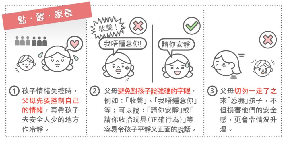 小朋友的情緒很多時轉變得很快,有時更會口是心非,當出現情緒失控時,父母宜先作出了解,及尊重他們的選擇;同時,要避免對小朋友說一些較強硬的字眼,例如:「收聲」、「唔好喊」、「我唔要你」及「我唔鍾意你」等,因為兇惡的語氣、負面的字眼,很容易牽動小朋友的情緒;建議父母可以對小朋友說:「請你安靜」或「我唔鍾意你將啲玩具周圍掉,請你現在收拾好。」等較為溫和、正面、有建設性的說話,令他們回復平靜、知道你的期望,做出正確的行為。