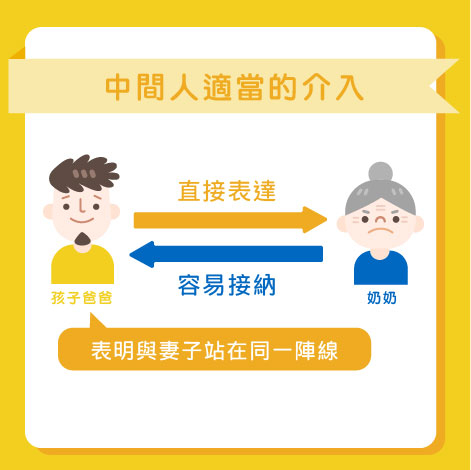 身為兒子,又是丈夫,加上是孩子爸爸的三重角色,中間人不妨直接跟媽媽表達:「亞媽,我認為你咁樣處理…」或是「我同亞英都認為你咁樣處理…」,前者的表達方式,是身為孩子爸爸的看法,縱使奶奶不以為然,因為是自己兒子出聲,就算不高興,都容易接納;而後者的表達方式,就明顯給奶奶感覺到,作為孩子父母的兒媳,二人是站在同一陣線上,就算要對抗反擊,要用的力氣也加倍,正所謂「兩支竹仔易折難」!