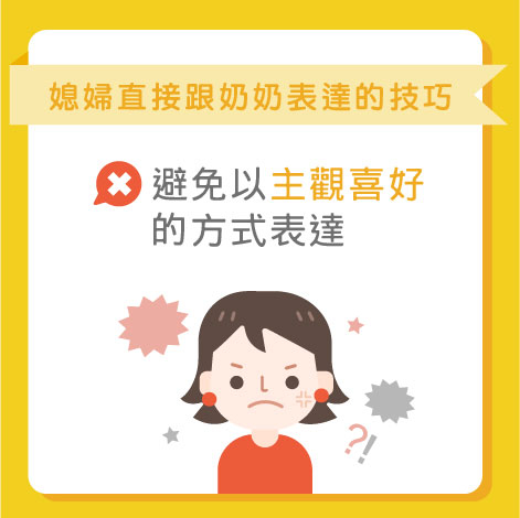 或許媳婦需要直接跟奶奶討論有關教養孩子的問題,就必須謹記,避免以主觀喜好的方式來表達:「奶奶,我最憎你咁樣湊亞B……」否則,奶奶礙於要維持作為長輩的尊嚴,或是啟動了心靈的防衛機能,她隨著而來反擊的攻勢,可能到時媳婦也招架不來!
