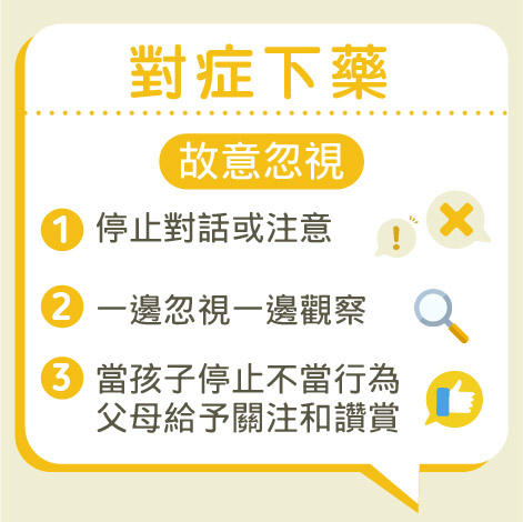 當孩子為了引起父母的注意而做出滋擾行為時,父母可以運用「故意忽視」的方法,令他們無法得到回應,漸漸感到沒趣,將注意力轉移至其他事情上,從而減少不當行為的出現。在應用「故意忽視」的技巧上,父母要停止與孩子的對話或注意,再一邊作忽視,一邊從旁觀察,當孩子停止出現以上行為時,父母應給予關注和讚賞。但值得留意的是最初實行「故意忽視」時,孩子可能會繼續做出引人注意的滋擾行為,但只要父母有所堅持,繼續運用,便會達到成效。