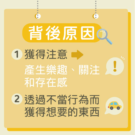 雖然孩子天性是愛表現自己,但當他們在不適當的場合做出一些標奇立異的行為時,家長可以了解他們做這些行為的背後動機,例如:有些孩子為了獲得父母、老師或同學的注意或誇讚而表現自己的「才藝」,從而產生一種樂趣、關注和存在感;又或他們想透過以上不當行為而獲得想要的東西等,都是引致他們表現不當行為的原因,從而可以作出正確的處理。