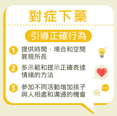 父母在處理孩子的不當行為時,要保持冷靜和堅定的態度,引導他們在適當的場合做適合的行為,例如:在課室要遵守規則、專心上堂;乘搭公共交通工具時要安靜,及不可以走來走去等,讓他們明白在不適當的場合做一些標奇立異的行為是不禮貌的表現,並會給別人造成滋擾。