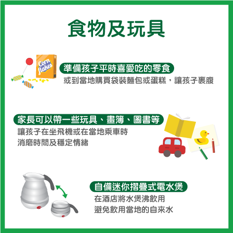 ‧家長執行李時,可以選擇數件孩子愛玩的細小玩具、圖書、畫簿或顏色筆,放於孩子的小背囊內,讓他們坐飛機或在當地乘車時消磨時間及穩定情緒。