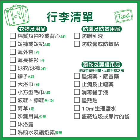 ‧家長出發前可以配備一些平安藥物,例如:止痾止嘔藥、退燒藥及感冒藥等,以備不時之需。