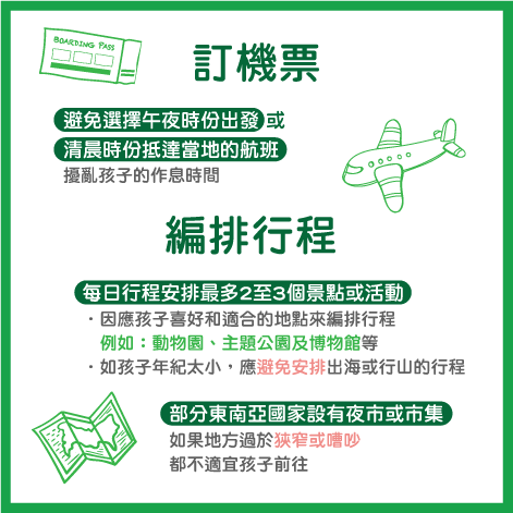 ‧家長購買機票時,避免選擇午夜時份出發,又或清晨時份抵達當地的航班,以免擾亂孩子的作息時間。