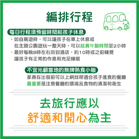 ‧在編排行程方面,最好以一家人覺得舒適和開心為主要目的,行程不宜過於緊密,全日最多前往兩至三個景點,以免家長和孩子辛苦;家長亦可以因應孩子喜好和適合的地點來編排行程,例如:動物園、主題公園及博物館等。