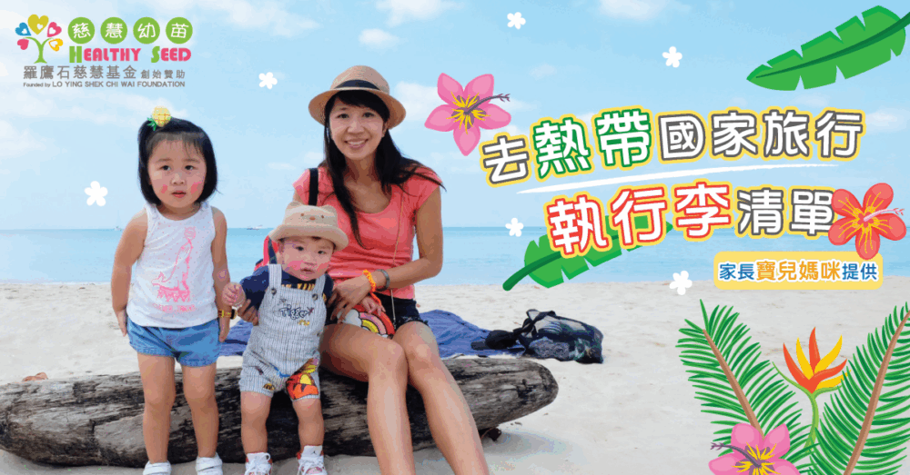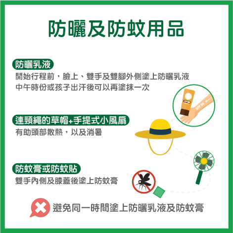 家長帶孩子前往一些熱帶國家旅行,最重要是注意防曬及防蚊,建議家長在當地開始行程前替孩子的雙手、雙腳及臉上塗抹一層薄薄的防曬乳液,到中午時份,或孩子出汗後可以再塗抹一次。出外時,孩子可以戴一頂連頸繩的草帽,有助頭部散熱,以及帶備一部手提式小風扇消暑。