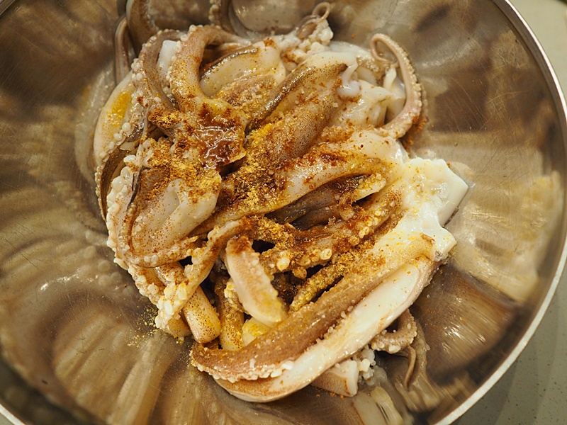 - 魷魚鬚洗淨,抺乾,切成2-3條鬚一份, 然後加醃料醃30分鐘