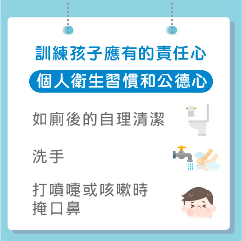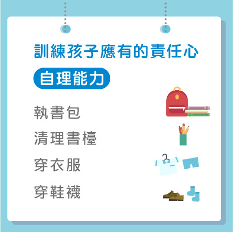 在自理能力方面,事事為孩子「照顧周到」的父母,可以嘗試將屬於孩子應有的責任,放手由他們自行處理,例如:訓練孩子執書包、清理書檯保持整潔、自己穿衣服、穿鞋襪等。此外,亦需要培養孩子建立良好的個人衛生習慣和應有的公德心,例如:如廁後的自理清潔、洗手、打噴嚏或咳嗽時掩口鼻等。