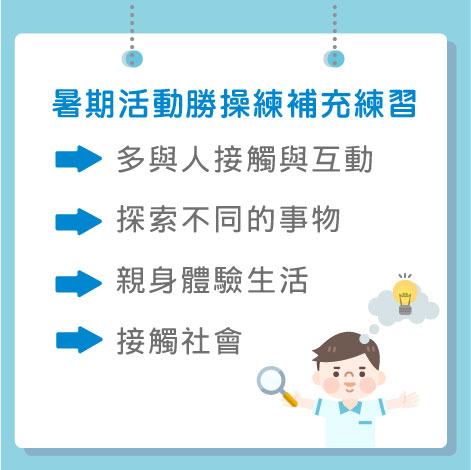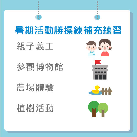 由幼稚園升上小學,孩子已適應群體學習生活,趁暑假期間,父母可以因應孩子的性格和興趣,鼓勵他們參加暑期活動或興趣班,藉此讓他們多與人接觸與互動。此外,父母亦可安排孩子參與體驗式的學習活動,例如:親子義工、參觀博物館、農場體驗、植樹活動等,讓他們探索不同的事物,親身體驗生活和接觸社會,藉著不同的活動以增廣見聞,亦可以減免孩子花時間躲在家中操練習作、看電視或玩手提電話。