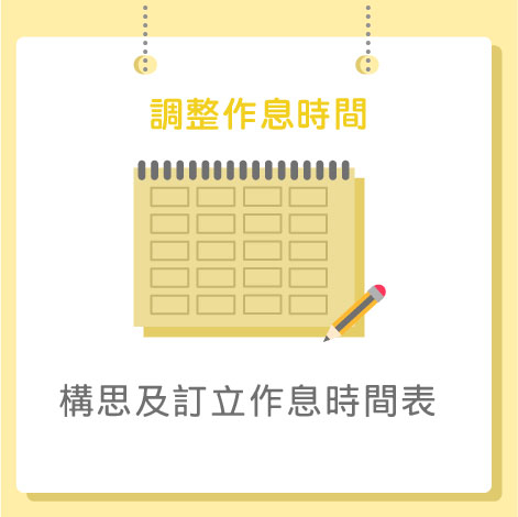 孩子升小後,各學科的學習要求會提高,上課時間亦會增加,因此父母需要協助孩子重新調整作息的時間,確保他們有充足的精神上學去。父母可以在開學前與孩子一起構思及訂立作息時間表,而所訂立的時間表,以三十至四十分鐘為一節,當中間以三至五分鐘作小休,除了電視或玩電子產品外,不妨容讓孩子自由運用自己的小休時間。此外,如果時間表編排至晚上睡覺前,中間宜多安排半小時至一小時屬於孩子的自由時間。