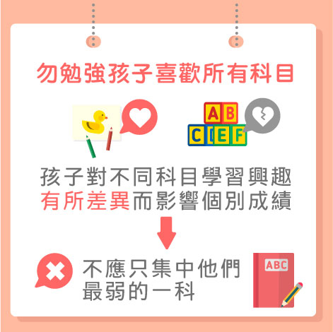 相對於幼稚園,孩子升小後要學習的學科相應增加:中、英、數、常識、普通話……等,孩子對每科的學習興趣,可能有所差異而影響個別成績,此時,父母宜多欣賞他們付出的努力,從旁鼓勵,而非只集中他們最弱的一科,強迫他們不斷地反覆操練。