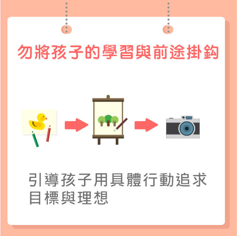 每個孩子的個性與能力盡不相同。若孩子喜歡體育或視覺藝術科,處理美勞習作比做學科功課更用心的時候,父母不宜有「荒廢學業」或「搞藝術將來找不到工作」的想法,而強迫他們先要處理「主科」 。父母要做的是培養孩子內在的學習動力,而非加重在他們的學習壓力,若孩子找到學習興趣與方向時,父母要做的是引導他們用具體的行動追求自己的目標與理想。