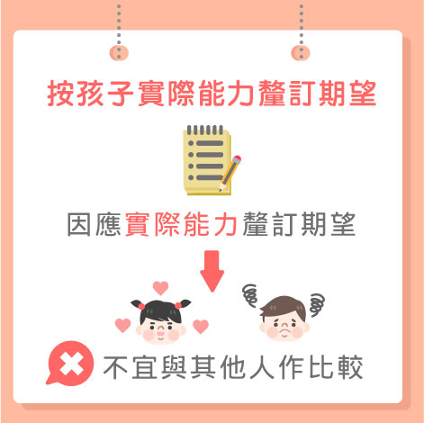 孩子升小後,父母對他們的功課、默書、測驗、考試的分數及名次有希冀時,謹記因應他們實際的能力釐訂這些期望,更不宜將自己的孩子與其他人作比較。
