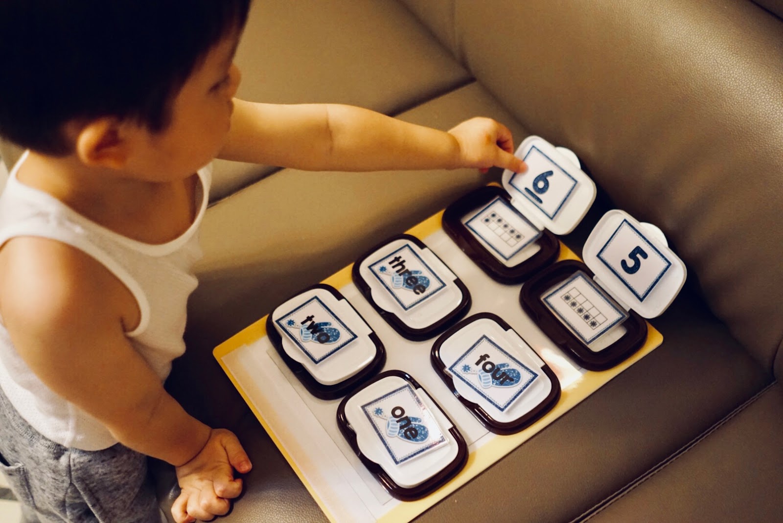 把全部濕紙巾打蓋,裡面已經事先放著數字圖卡,請孩子依著數數再把對應的數字圖卡貼上,蓋上蓋子可以再對應英文數字圖卡即完成任務。