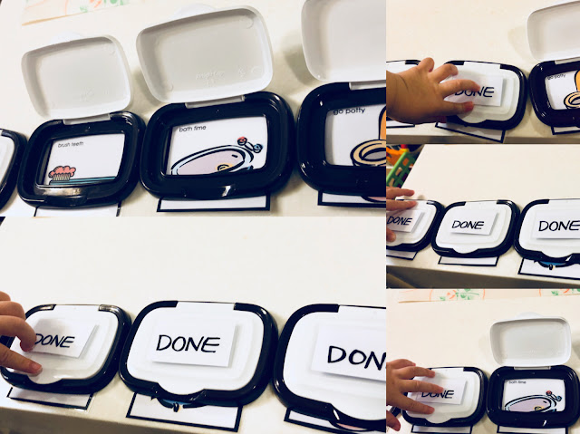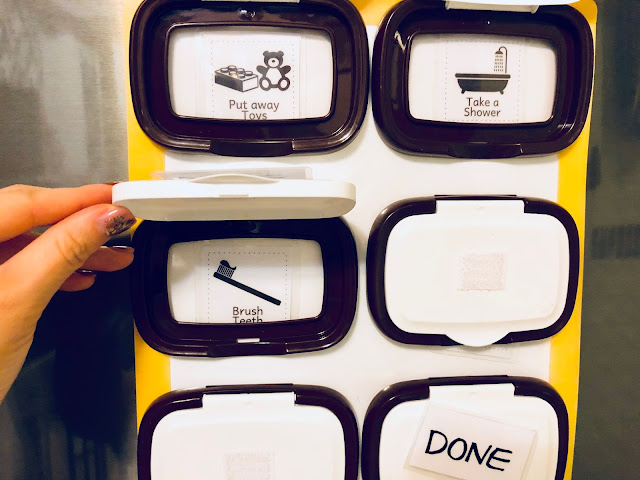 爸媽可以試試我這個方法,把幾個濕紙巾蓋貼在牆上,完成一項就闔上一個,全部完成就給孩子一個大大的讚,如此一來孩子一定超有成就感。