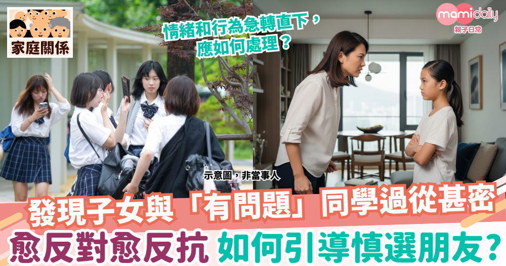 當發現子女與一些被認為「有問題」的同學過從甚密時,內心響起警號是很自然的反應。出於關心和保護,家長可能會直接地說:「我唔鍾意你同嗰個同學玩,佢品行唔好。」但結果往往事與願違,孩子不但沒有疏遠對方,反而激烈地反駁:「你根本唔了解佢!我朋友唔係壞人!」一場親子戰爭隨即爆發,溝通的大門亦被重重關上。家長應如何處理呢?