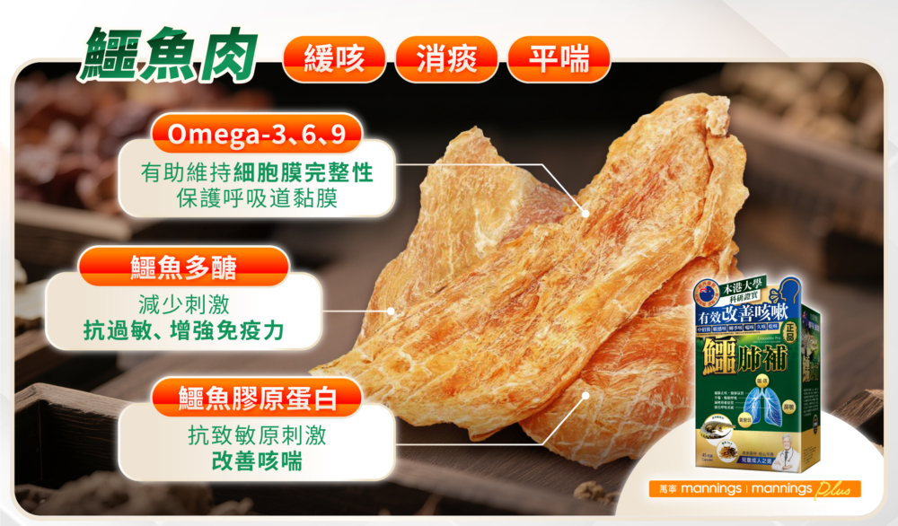 鱷魚多醣: 不但增強免疫系統,更可在上呼吸道黏膜形成保護膜,減少外來刺激引致的咳嗽 。