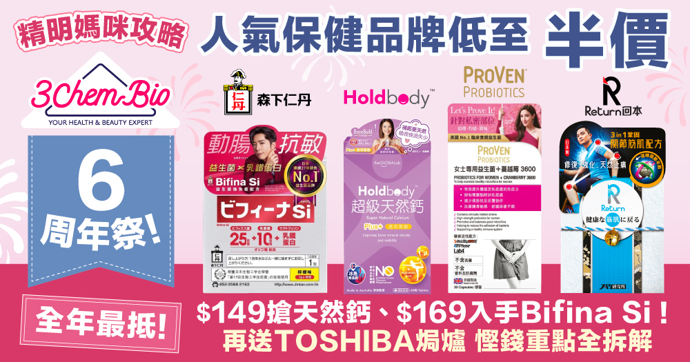 【精明媽咪攻略】3ChemBio 6周年祭!人氣保健品牌低至半價 $149搶天然鈣、$169入手Bifina Si!必搶TOSHIBA焗爐 慳錢重點全拆解
