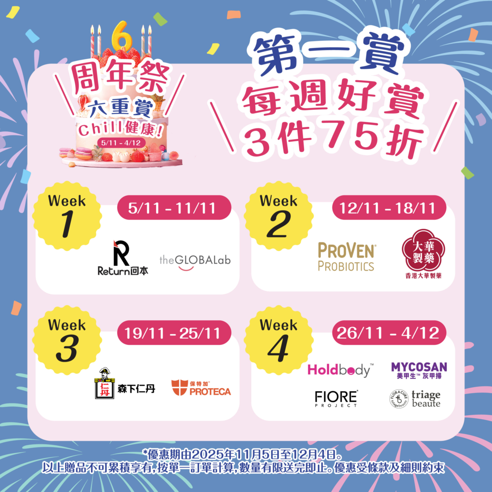 佢哋嘅年度最強優惠【6周年祭‧六重賞Chill健康】將會喺 11月5號 隆重登場,一連四星期,無論網店定門市,買開嘅 ProVen、森下仁丹、HoldBody 等皇牌產品,低至半價!