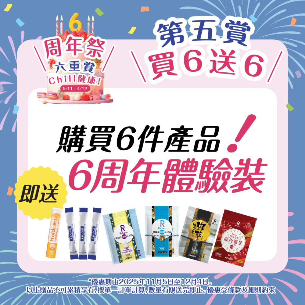- 買任何產品6件,就會送多一份「6周年體驗裝」,入面有齊Bifina、Return關節、Holdbody維C等6款皇牌試用裝。一次過試晒,睇下邊款啱自己同屋企人。