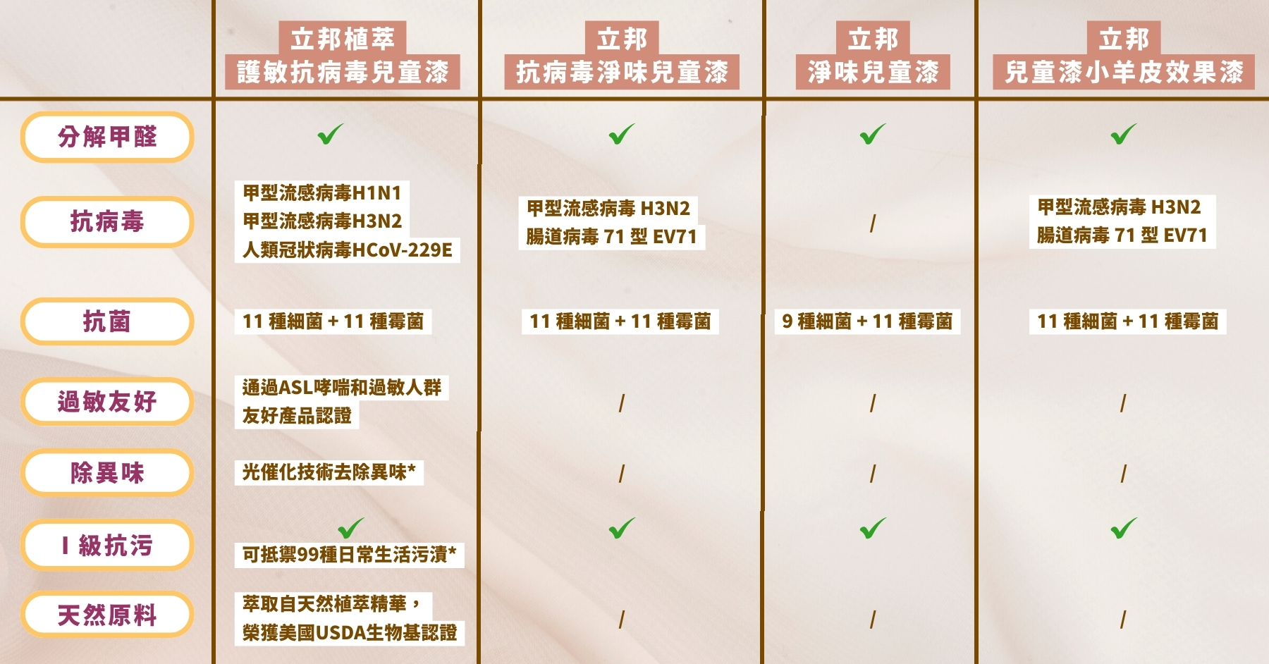 以上4款產品其實就是市面經常提及的立邦小王子兒童漆系列,這個系列憑藉多項高科技和安全認證,提供切實的健康保障,立邦植萃護敏抗病毒兒童漆創新使用光催化技術⁸,在光線的作用下,可持久長效淨化甲醛,並有效去除異味,讓兒童在舒適小天地呼吸好空氣!