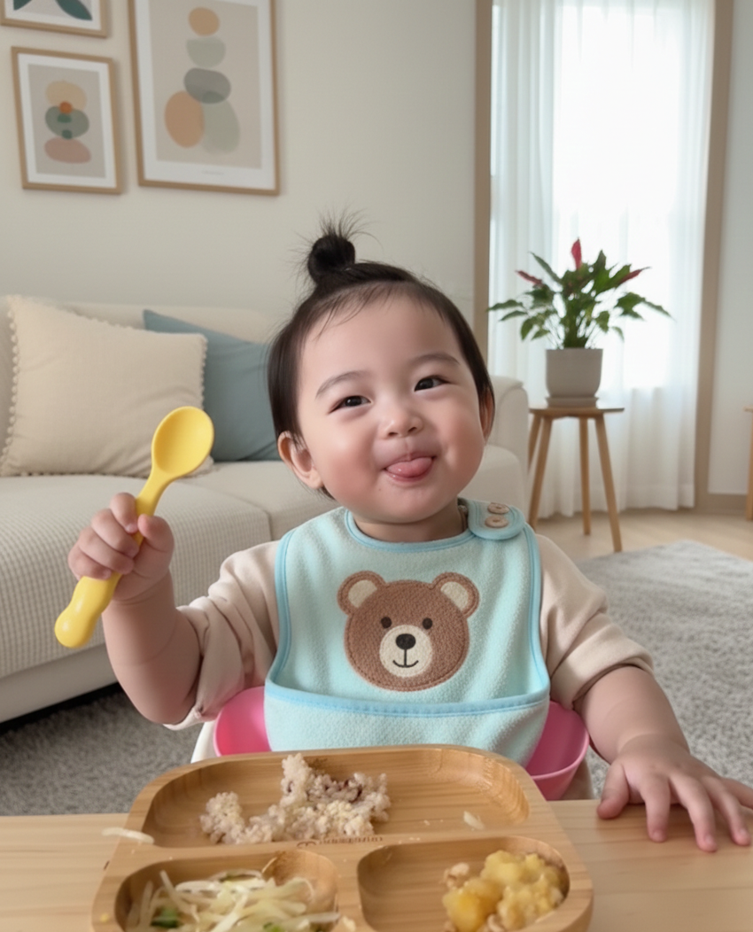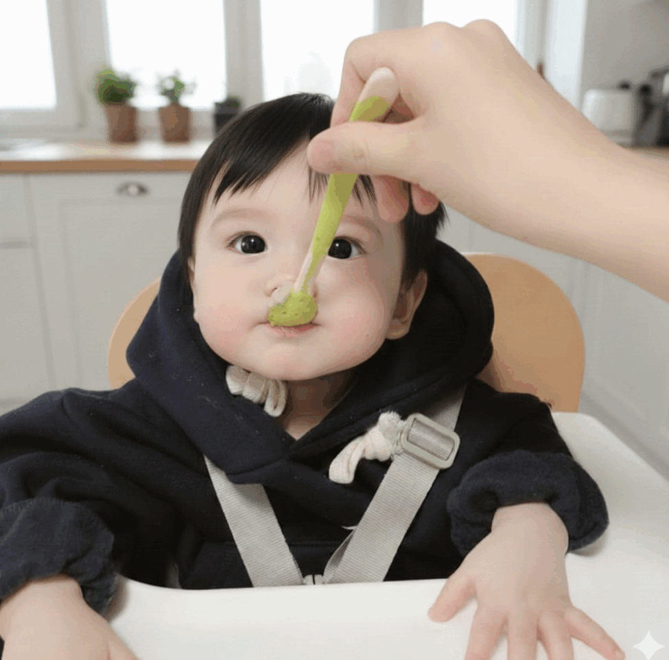 優點:匙頭已經固定角度,寶寶只需做出簡單的「抓握並舉起」動作,食物就會自然地對著嘴巴。