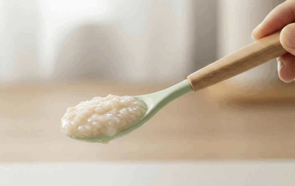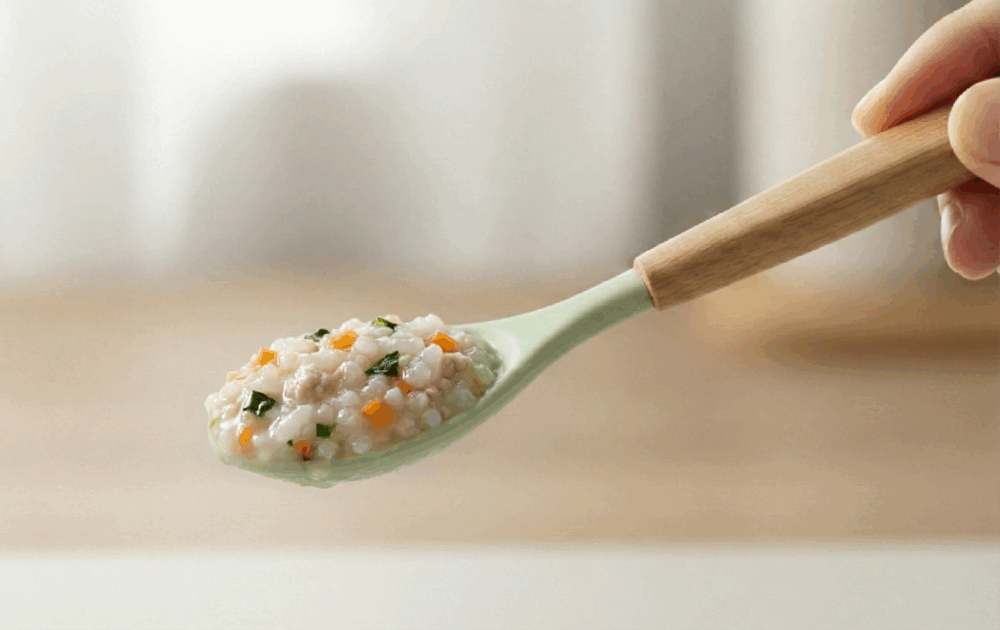 大幅提升咀嚼力,練習用牙床/牙齒「咬碎」食物,增加食物多樣性。 寶寶可能已經長出幾顆小牙,咀嚼力大幅提升。食物質地應該轉變為顆粒感更明顯、甚至接近軟飯的小塊狀(例如四倍粥、軟飯),硬度大約像熟透的香蕉,幫助寶寶練習真正的咀嚼與吞嚥,而非只用舌頭壓。