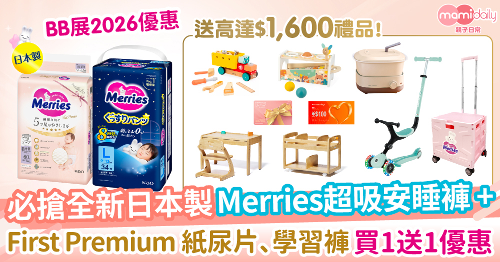 看完介紹是否想立即入手?機會來了!1月30日至2月19日,於BB展及萬寧/百佳/屈臣氏/惠康的網店購買Merries 超吸安睡褲及First Premium 系列都有激抵優惠。即日起至2月12日於BB展及萬寧/百佳/屈臣氏/惠康的網店買First Premium系列滿$800,更送$100電子優惠券或現金券。