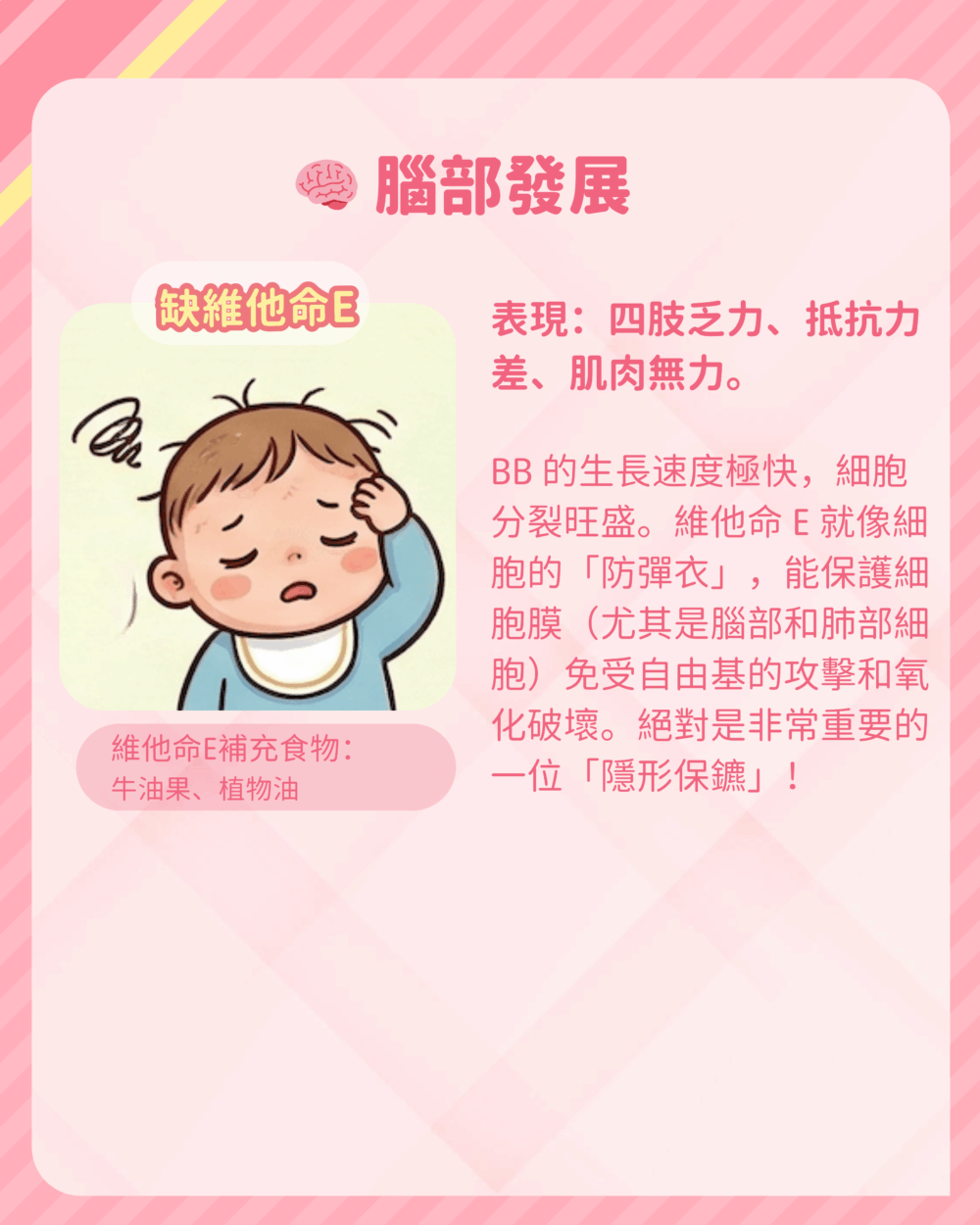 BB 的生長速度極快,細胞分裂旺盛。維他命 E 就像細胞的「防彈衣」,能保護細胞膜(尤其是腦部和肺部細胞)免受自由基的攻擊和氧化破壞。絕對是非常重要的一位「隱形保鑣」!