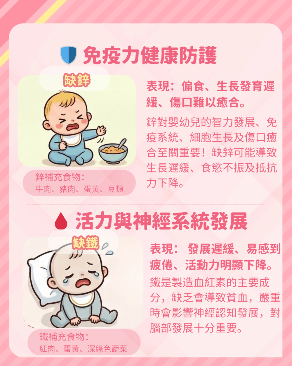 鋅對嬰幼兒的智力發展、免疫系統、細胞生長及傷口癒合至關重要!缺鋅可導致生長遲緩、食慾不振及抵抗力下降。