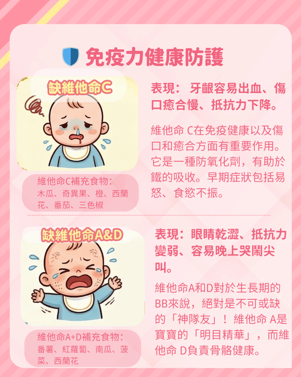 維他命A和D對於生長期的 BB來說,絕對是不可或缺的「神隊友」!維他命 A是寶寶的「明目精華」,而維他命 D負責骨骼健康。