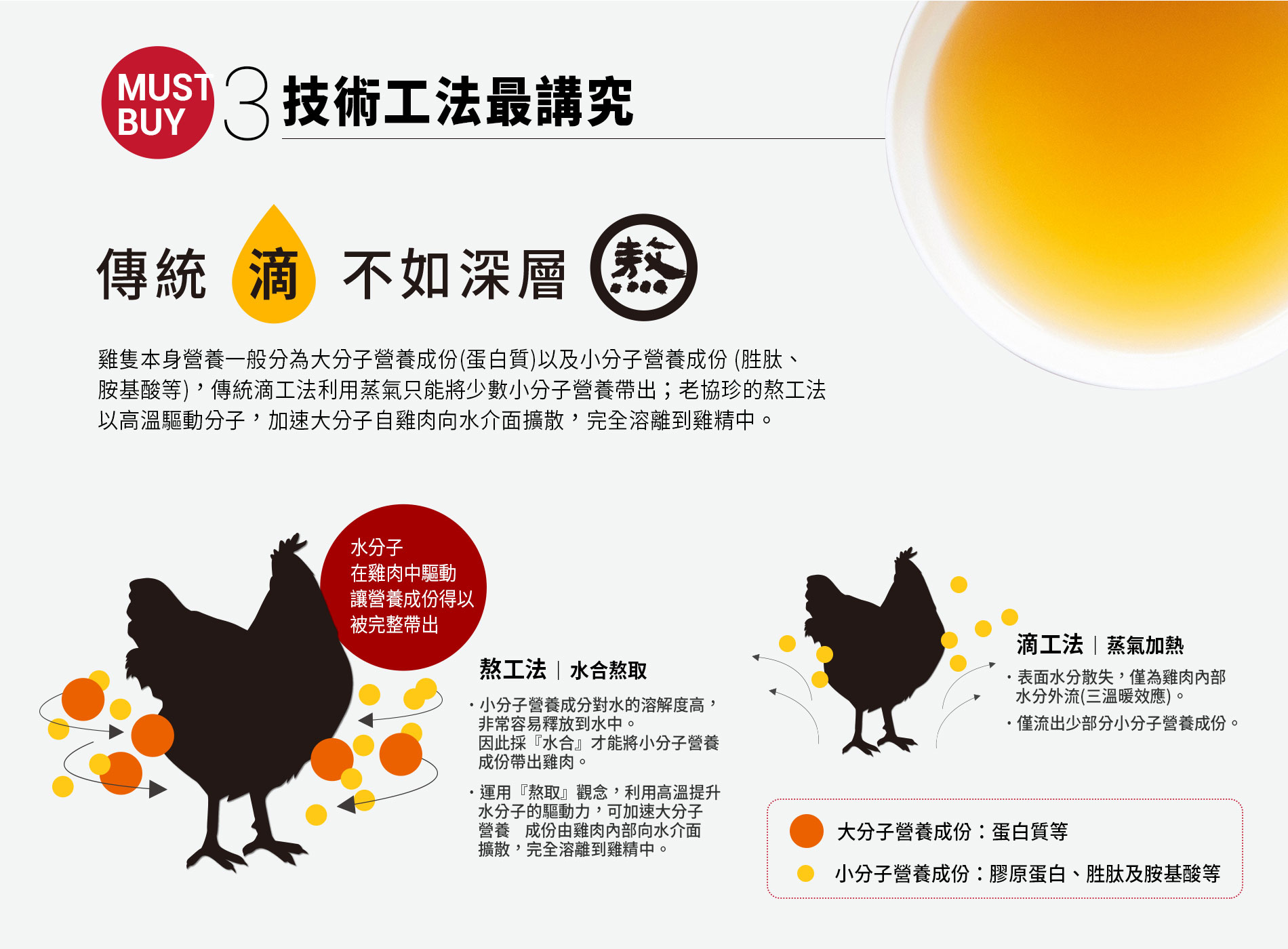 佢同滴雞精有咩分別呢?傳統嘅滴雞精利用蒸氣只能滴出表面的肉汁,但其實雞隻本身仲有好多不同大小分子營養,同埋我地自己用燉盅都可以做到,而熬雞精 老協珍獨創『熬工法』利用水合作用,用高溫驅動大小分子,可以深層萃取出老母雞與豬腩排中5倍濃縮(含蛋白質、胺基酸 、膠原蛋白),所以熬營養成份比一般嘅滴雞精高好多。